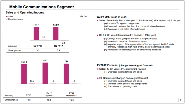 All divisions reported a profit in Sony’s second quarter, apart from its mobile business. Mobile sales during the quarter were down by 3% on a constant currency basis, with an operating loss of 2.5 billion yen. Sony attributed this loss due to a change in the geographic mix of smartphone sales and an increase in the price of key components.